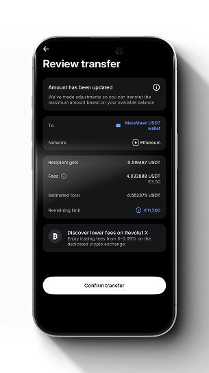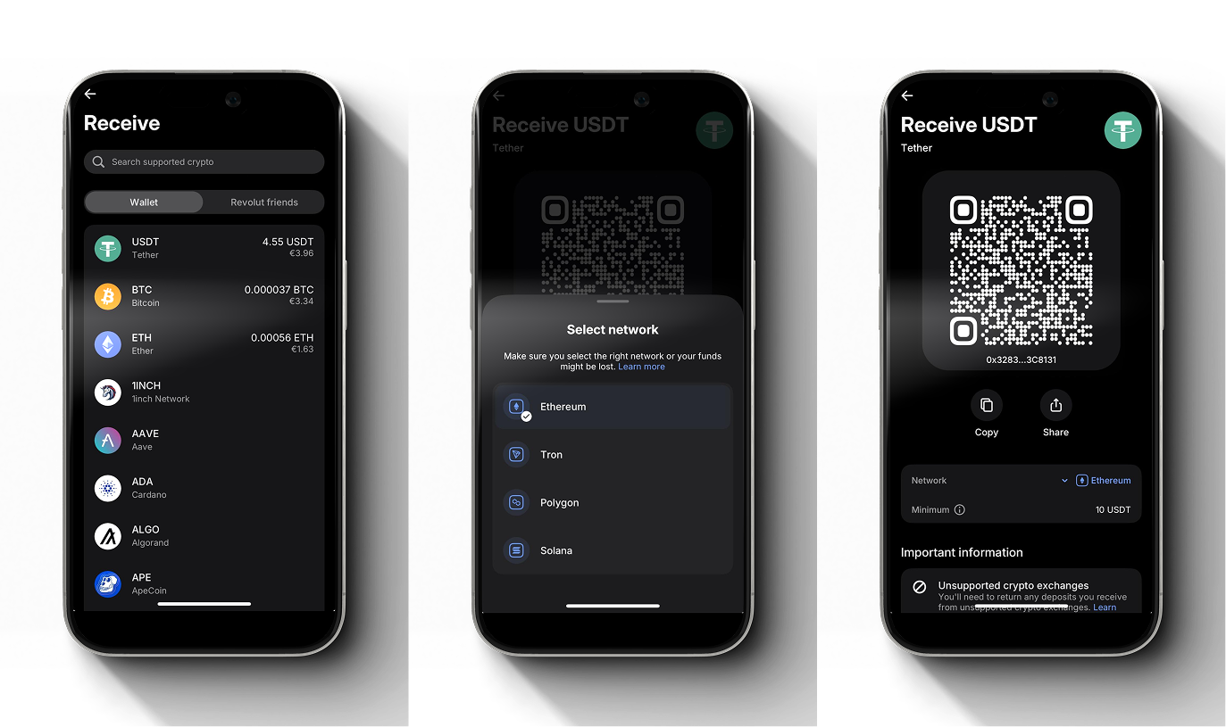 • The correct blockchain network confirmed – Revolut currently supports USDT on Ethereum (ERC-20) and Tron (TRC-20) for deposits and withdrawals