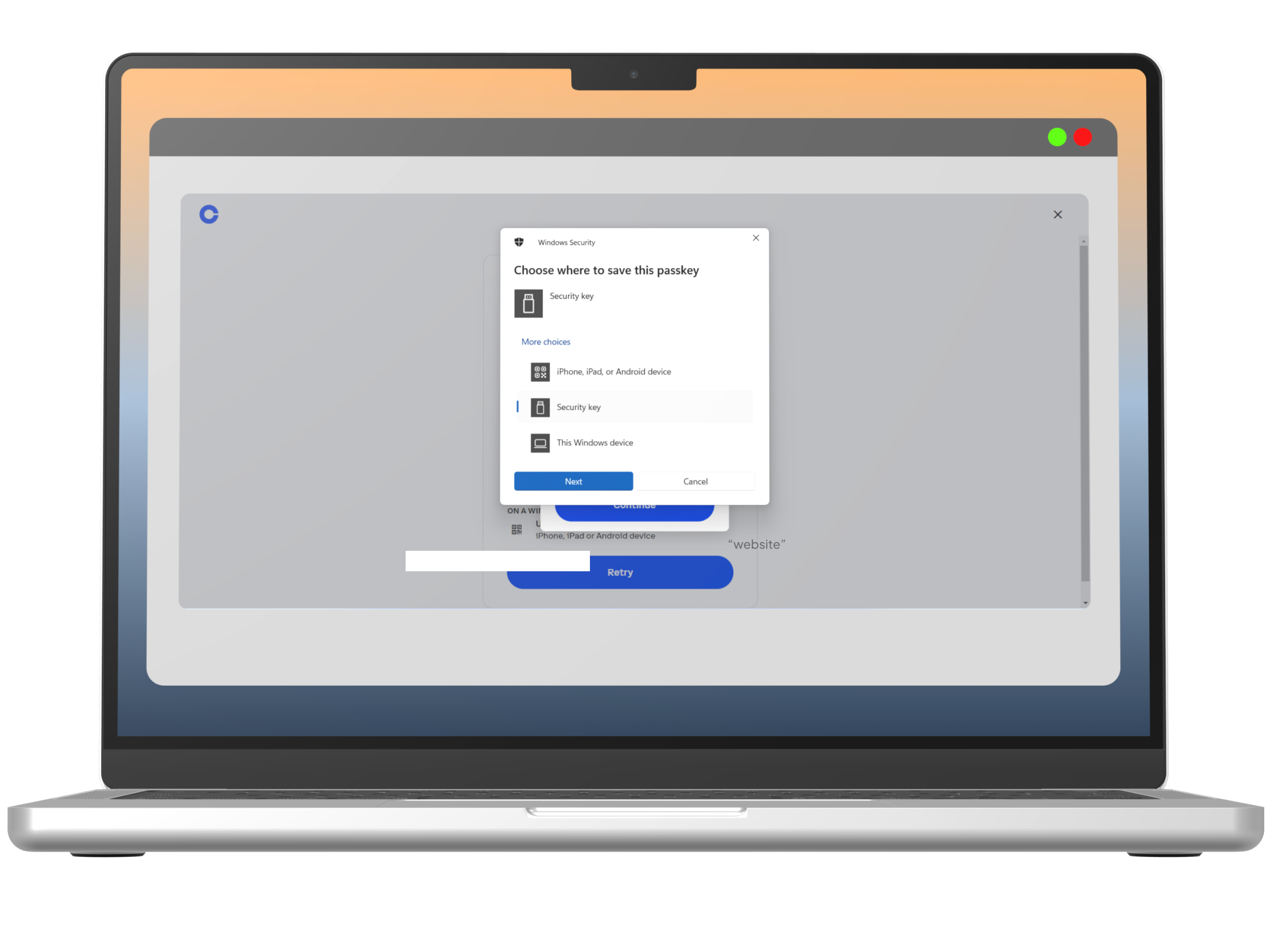 The system will prompt the available options to setup a passkey. Ensure to select the “Security key” and select “Next”.