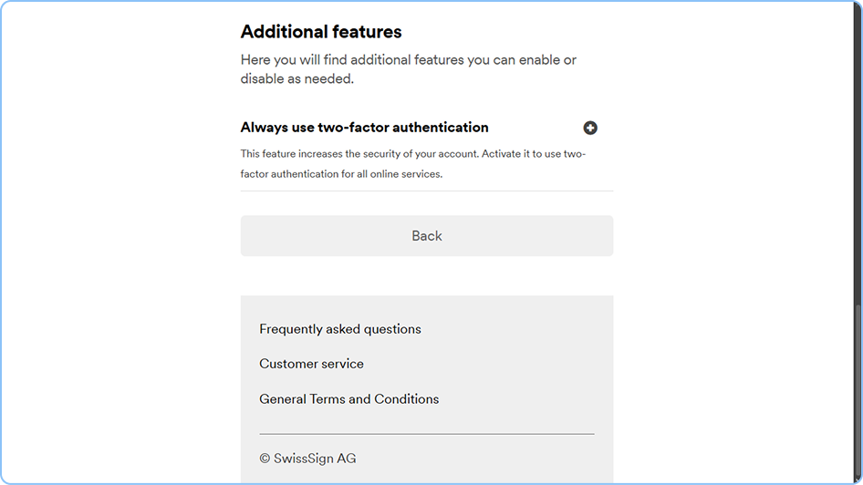 In your SwissID account Settings, scroll to the “Additional features” section. Find “Always use two-factor authentication” — this feature increases security by requiring 2FA for all online services. Click the “+” button to enable it.