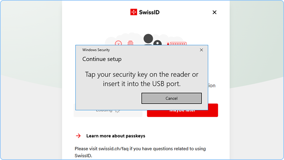 A Windows Security popup may appear saying “Continue setup — This will let login.swissid.ch see the make and model of your security key.” Click “OK” to proceed.