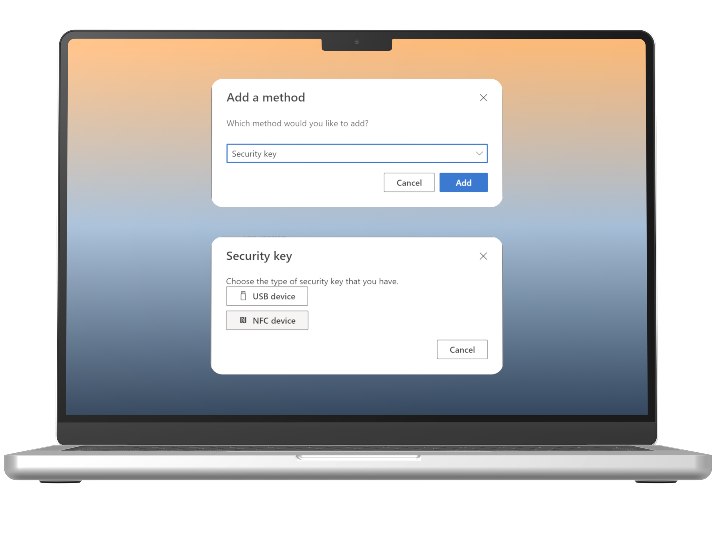 The system will prompt to select a method. Choose “Security Key” and select “Add”. In the next pop up, select “NFC device”.