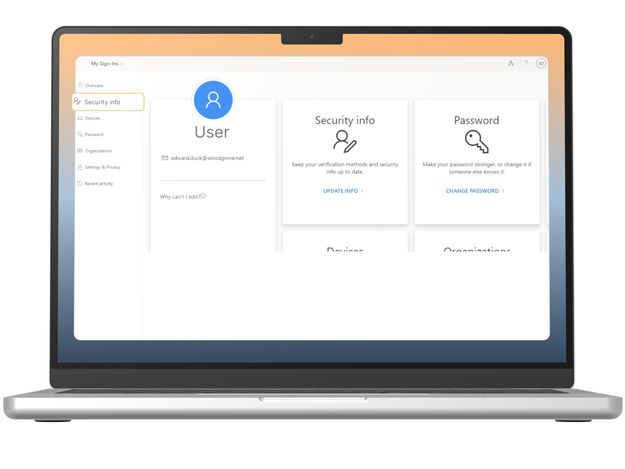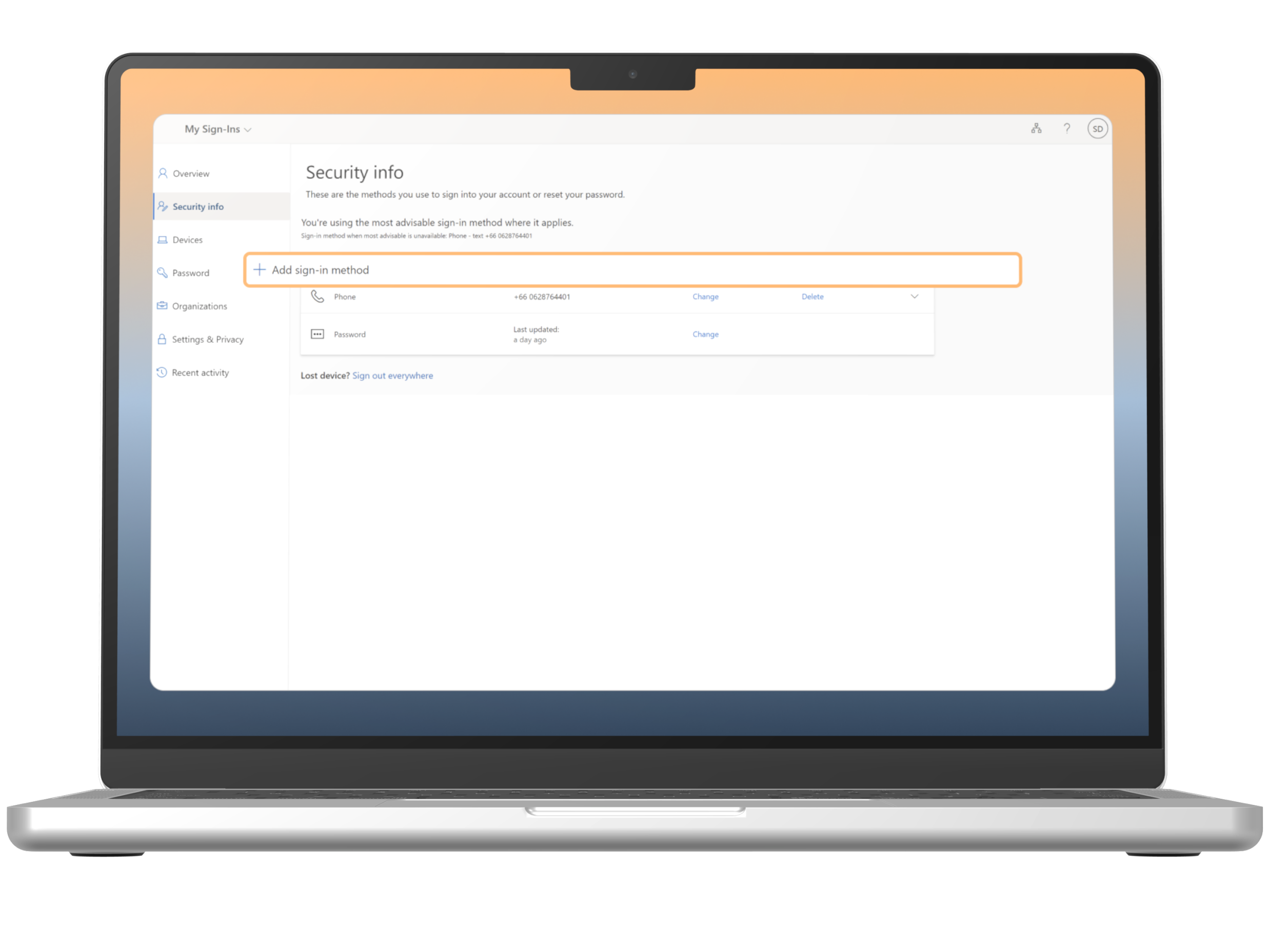 In the Security info, select “Add sign-in method”.