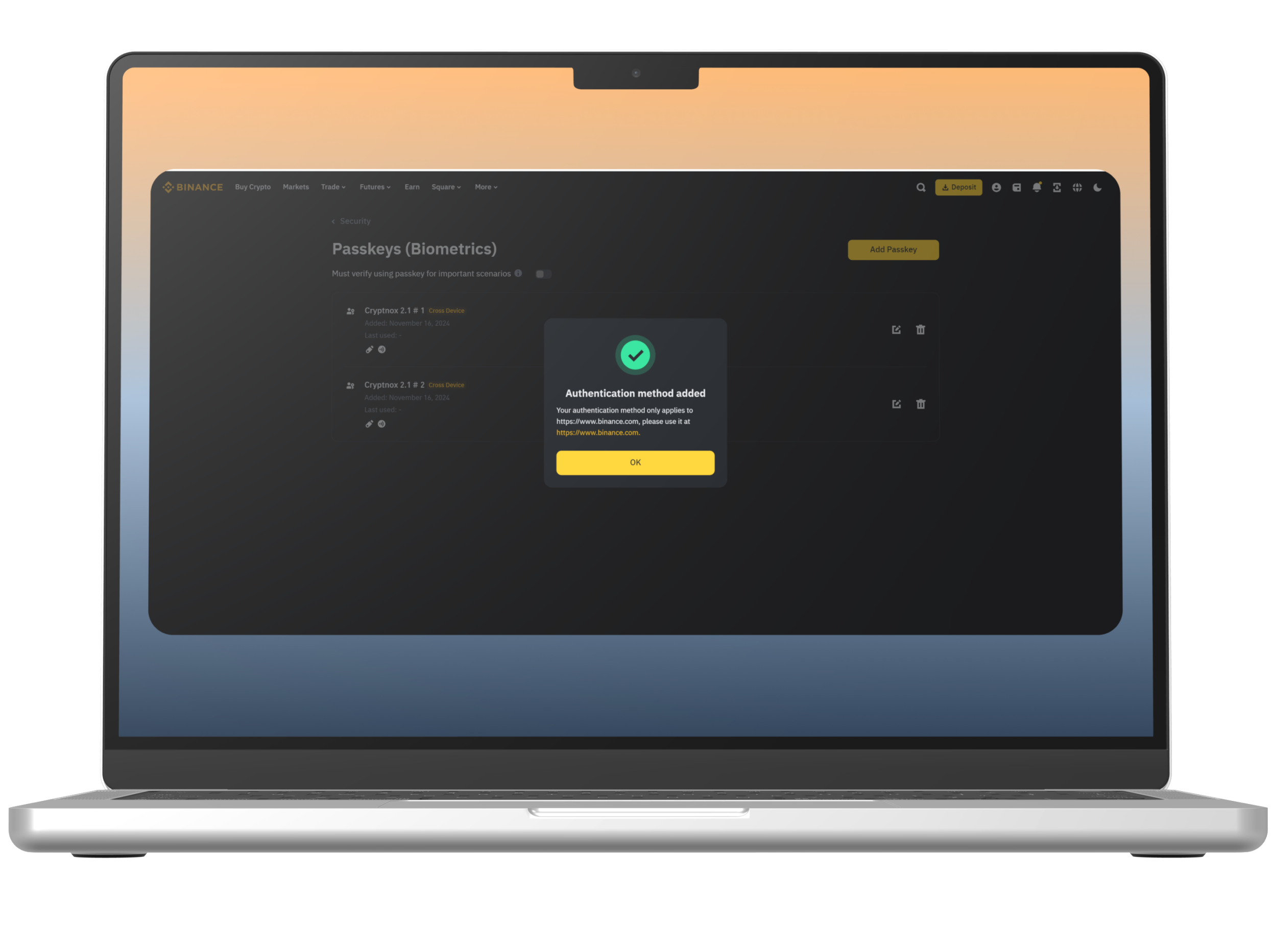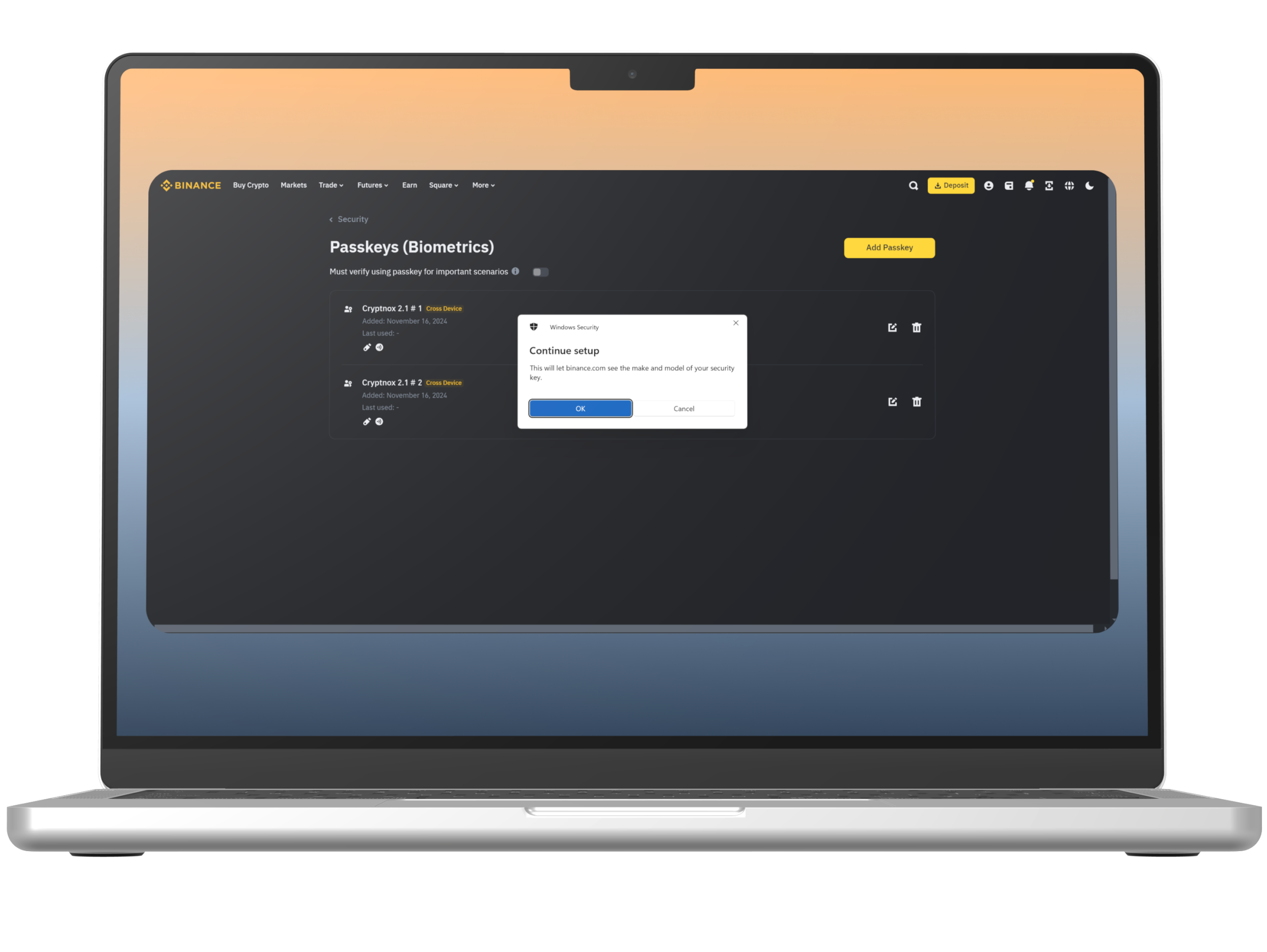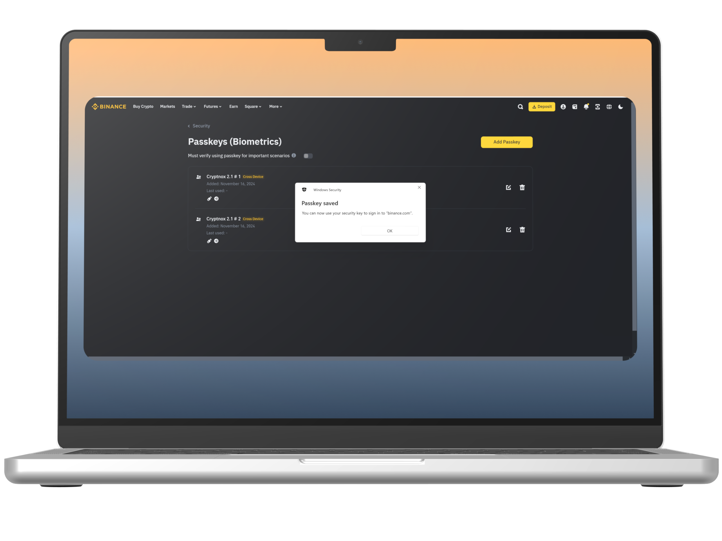 You have successfully setup the Cryptnox FIDO2 passkey on Binance.
