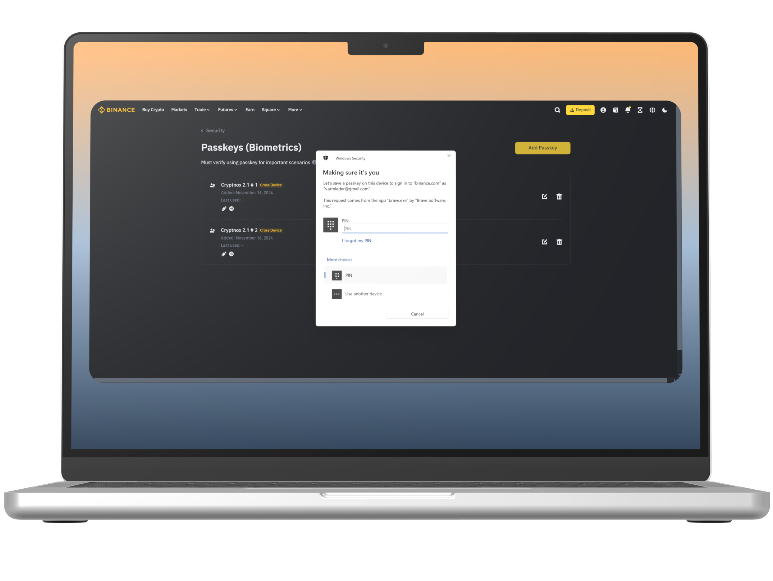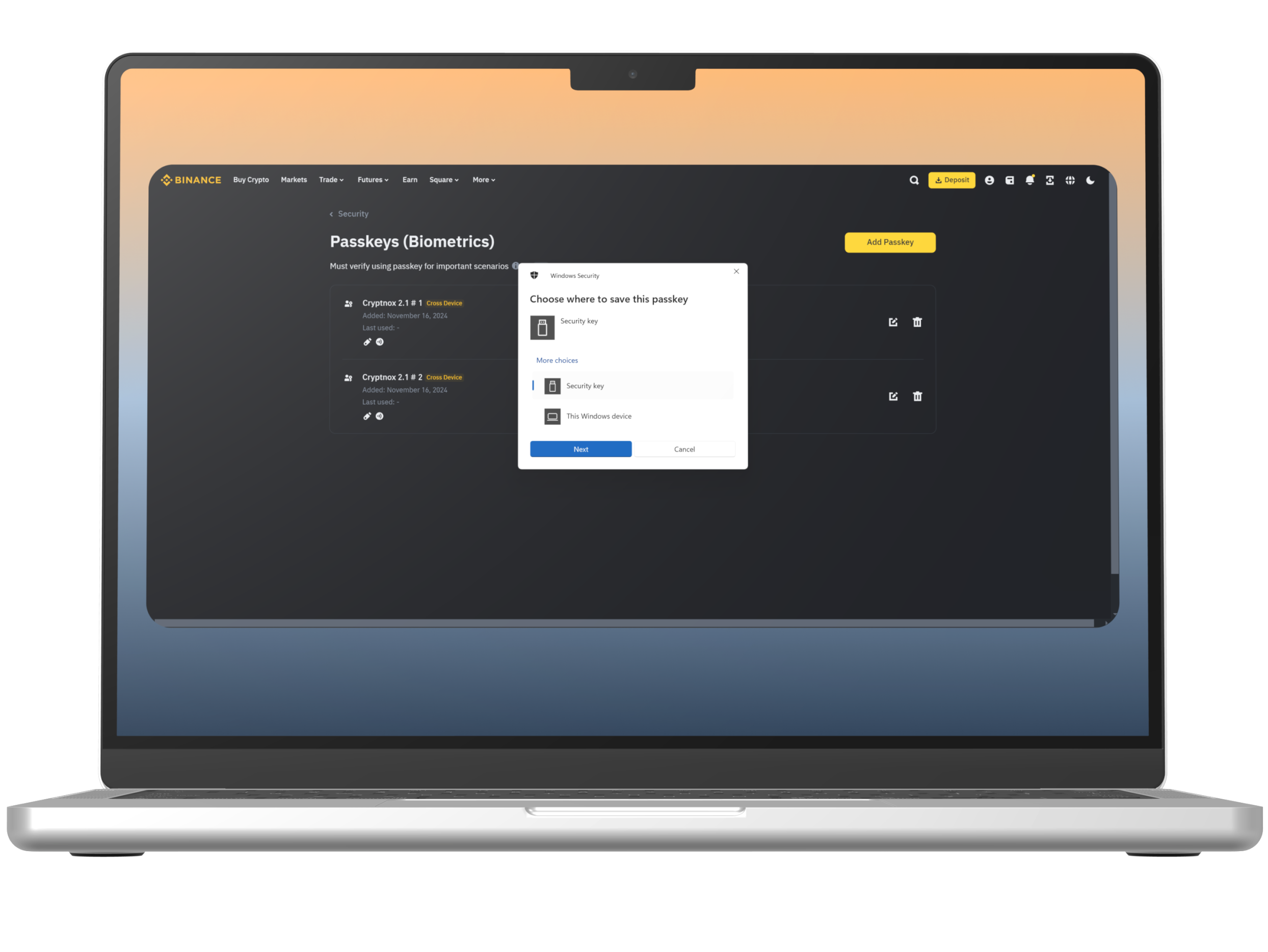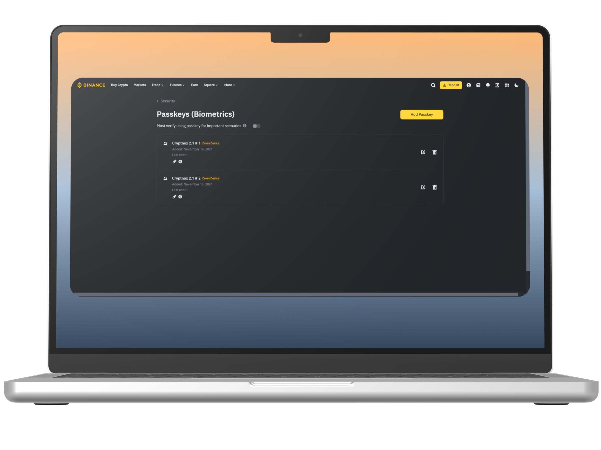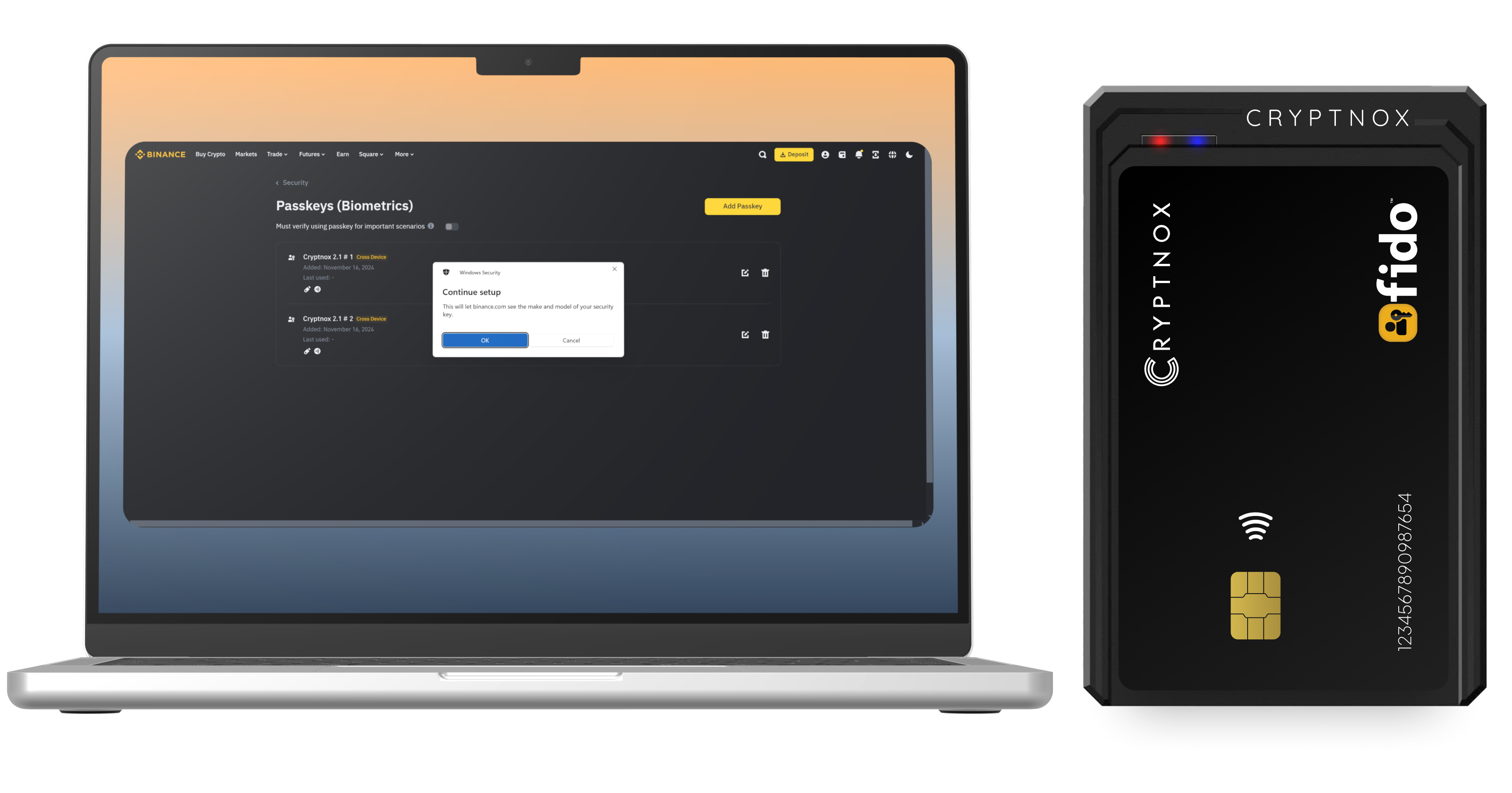 You have successfully setup the Cryptnox FIDO2 passkey on Binance.