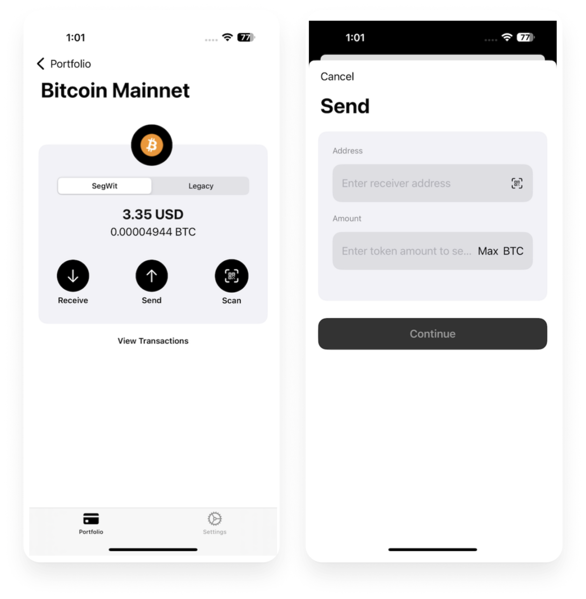 Receiving: Users can receive Bitcoin with P2PKH (legacy) and P2WPKH (native SegWit) addresses.